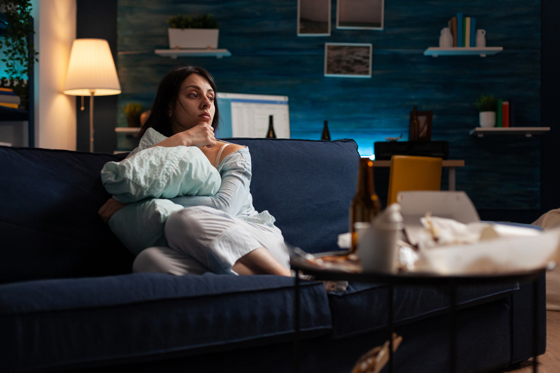 Frau sitzt abends nachdenklich auf dem Sofa und denkt über Verantwortung im Alltag nach